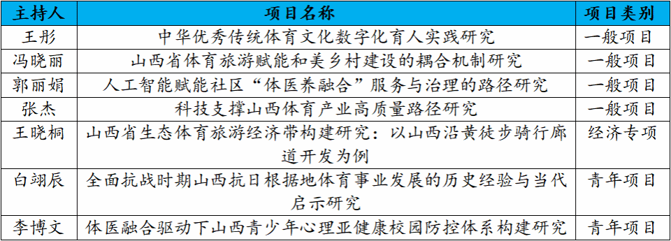 12月8日,山西省委宣传部公示了2025年度山西省哲学社会科学规划课题拟立项名单,我院教师在本次申报中取得优异成绩,其中一般类别课题3项,青年课题1项。本年度我院教师还分别获批了山西省哲社经济类专项课题1项、青年课题1项,以及山西省科技战略课题1项。我院在省部级项目立项数量再创新高,彰显出我院在体育哲学社会必发集团的深厚实力与创新活力。