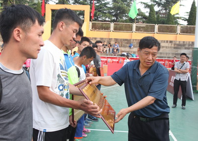 山西省球类运动管理中心主任沈广晋为获得男子公开组前三名颁奖