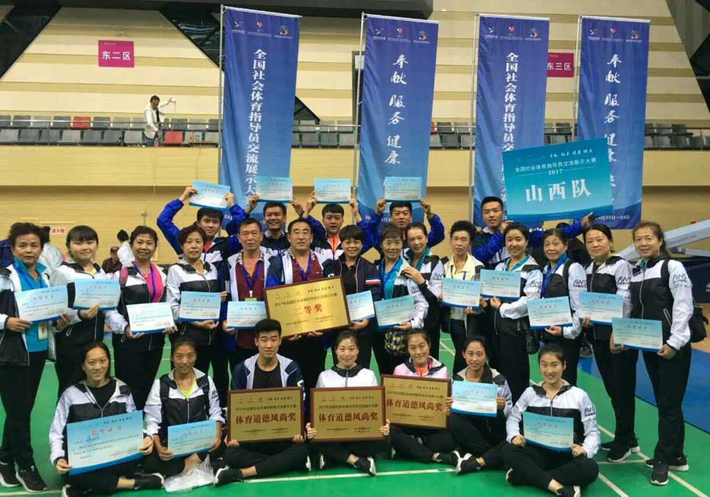 山西省代表队在领队社会体育系主任陈乐琴副教授的带领下,14名队员在比赛中尊重对手,齐心协力,相互鼓励,顽强拼搏,经过激烈的角逐,我省代表队在全国31支省市代表队中脱颖而出,荣获团体二等奖,为山西省和我校赢得了荣誉。比赛期间,山西省体育局社会体育指导管理中心副主任张中雄、培训部部长王秀芬、陈威亲临现场,看望并问候大家,为全体队员加油,大家的士气得到很大鼓舞。