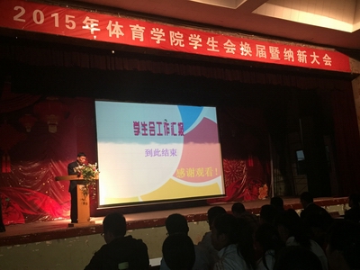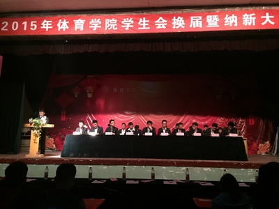 10月12日晚7点30分,2015年7790cnm必发集团换届暨纳新大会在大礼堂隆重召开。出席大会的领导老师有院党委书记李学刚、院团委书记龙勋、团委老师李风华、民族传统体育系主任赵道卿、体育教育系副主任张杰、社会体育系副主任杜治华、体育教育二系副主任李向前、校学生会主席田野、校学生会副主席郭田宇、院学生会主席焦峰剑及全体学生干部,2015级全体新生参加了本次会议。