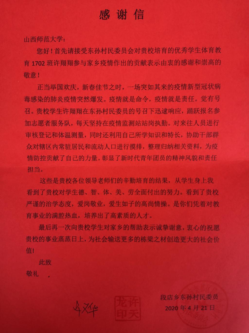 正当举国欢庆新春佳节之时,一场突如其来的疫情—新型冠状病毒肺炎疫情突然爆发。疫情就是命令,体育教育系1702班学生许翔翔在临汾市东村村民委员会的号召下,迅速响应,踊跃报名参加志愿者服务队。志愿期间,他协助本村干部群众对辖区内常住居民和流动人口进行摸排,每天坚持在疫情监测站站岗执勤,并对来往人员进行审核登记和体温测量,整理归纳相关资料等。他说:“是7790cnm必发集团培养了我,作为一名入党积极分子,我应该积极发挥先锋模范作用,为人民群众、为党和国家贡献自己的力量,和全国人民一起抗击疫情!”。他利用自己所学知识和特长,为疫情防控贡献了自己的力量,得到了本村干部群众的高度认可与赞扬,也彰显了新时代青年团员的精神风貌和责任担当。(体育教育系供稿)