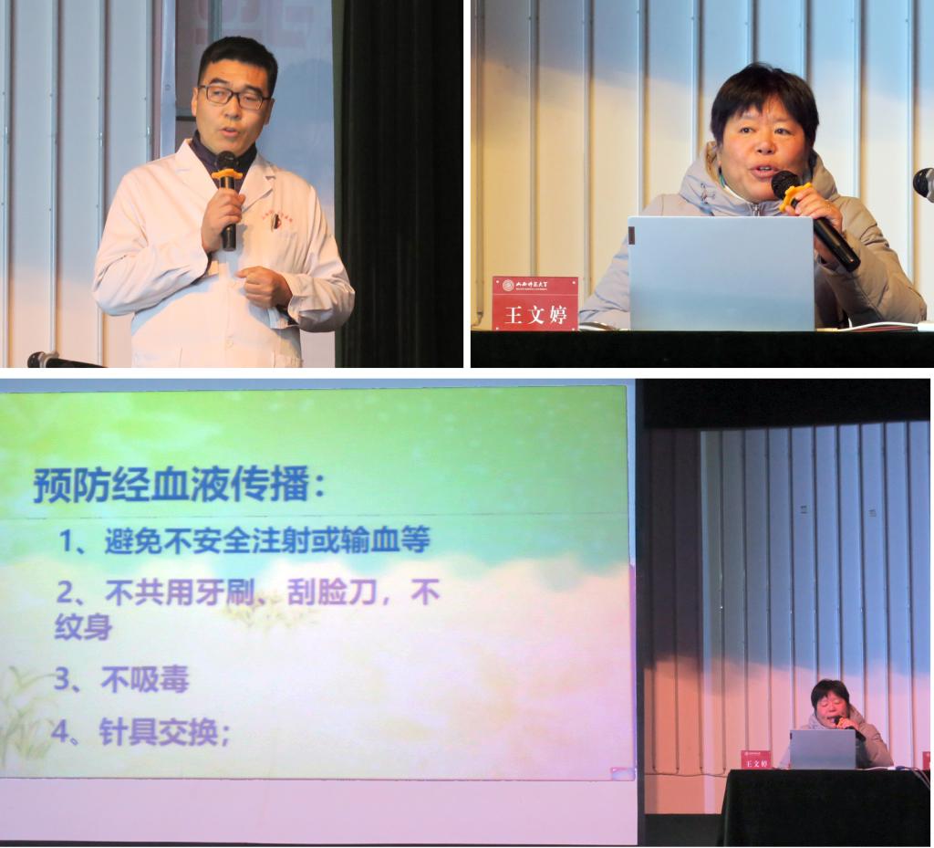 在第33个“世界艾滋病日”来临之际,为了提高我校学生对艾滋病防治的认识,增强自我保护意识,12月1日晚19:30,校医院邀请临汾市疾控中心专家王文婷在7790cnm必发集团大礼堂举办了以“携手防疫抗艾·共担健康责任”为主题的讲座,校医院副院长赵根锁参加,7790cnm必发集团500余名师生聆听讲座。讲座由三校区卫生所秦汇丰医生主持。