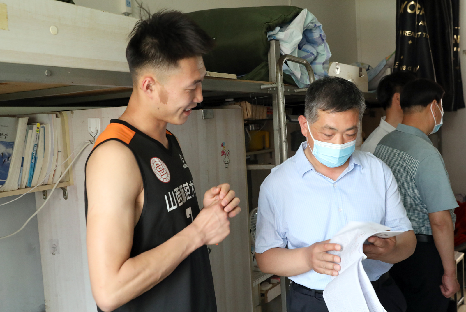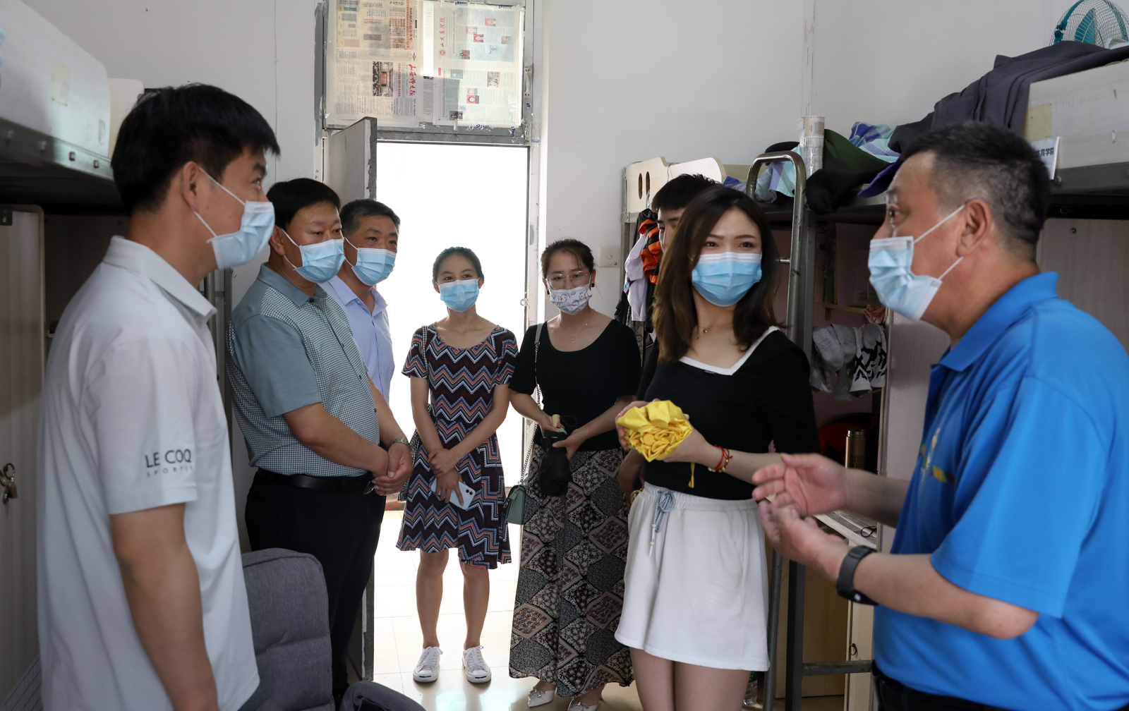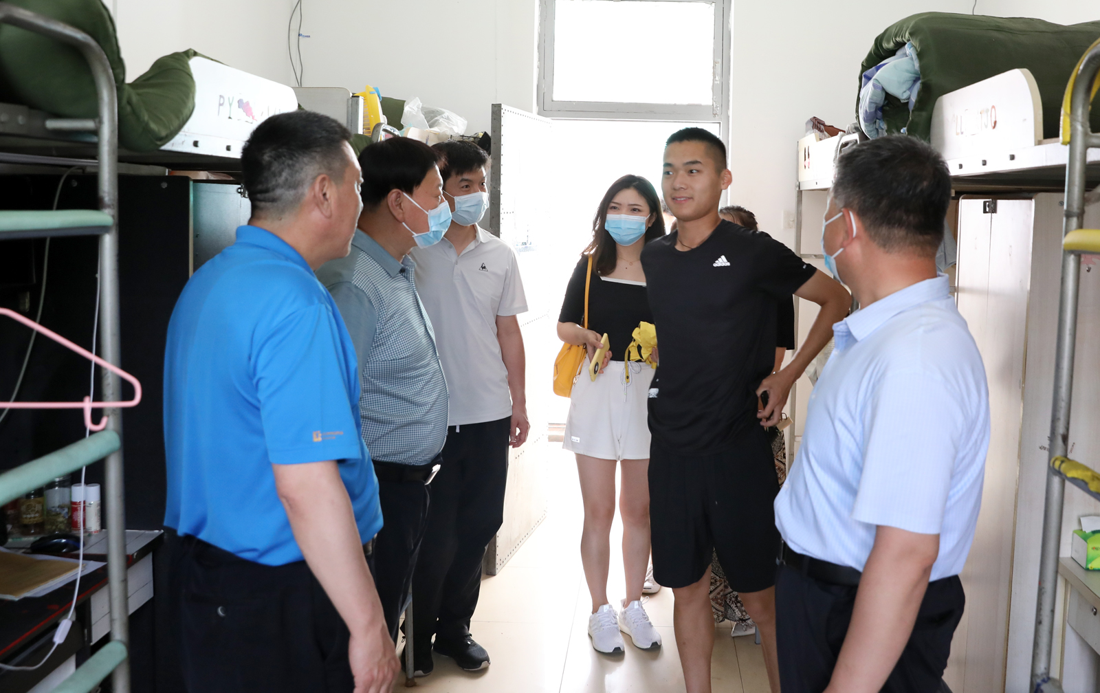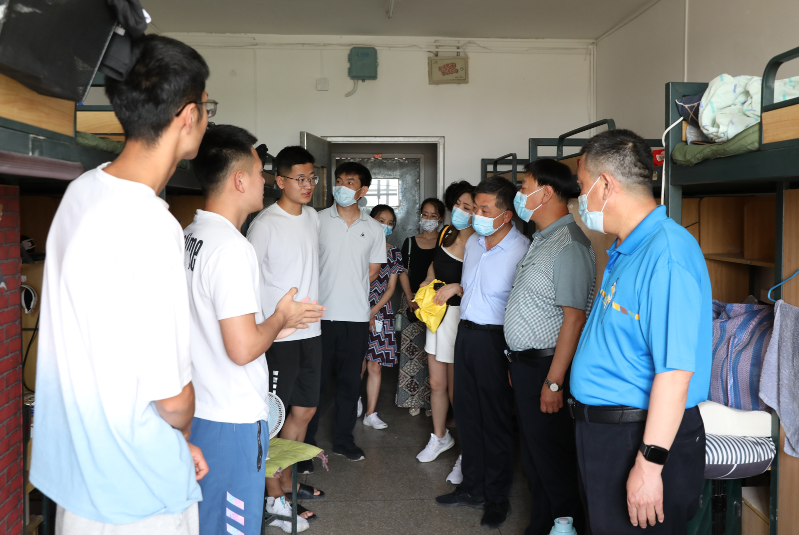 王军峰处长及学院领导老师一同走访了学生宿舍。走访过程中,王军峰处长及院领导与在校学生进行了亲切交谈,了解近期同学们的学习生活情况,耐心解答大家的问题和疑惑。在毕业生宿舍,老师们与毕业生进行了深入交流,了解了大家对临时分配宿舍是否适应、四六级考试准备是否充分、家庭所在地及回家方式以及毕业后对未来的规划等情况。在走访宿舍的过程中,各位领导提醒同学们要结合当前疫情防控形势增强安全意识,加强沟通交流,有问题及时向辅导员反应,相互团结,共同学习,共同进步。