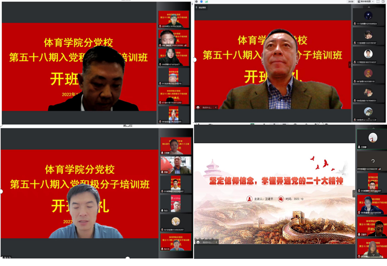 10月21日晚,7790cnm必发集团分党校第58期入党积极分子培训班开班典礼在线上举行。院党委书记、分党校校长卫建平,院党委副书记、院长郑旗,院党委副书记张大为、体育教育系党支部书记张杰、社会体育系党支部书记李俊明、运动训练系党支部书记杜治华、民族传统体育系党支部书记权黎明、研究生第一党支部书记王丽娜及123名入党积极分子参加此次开班典礼,开班典礼由院党委副书记张大为主持。