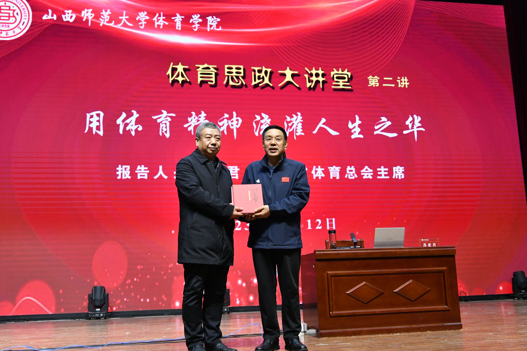讲座中,苏亚君主席以《诗华》中一首首即兴赋吟、挥洒自如的诗作为主线,娓娓道来山西体育波澜壮阔、荡气回肠的历史故事,他以诗词的形式还原了山西省近年来体育奋斗路上的座座丰碑,一首首饱含深情的体育诗词,通俗易懂,朗朗上口,极富感染力,记载着曾经的难忘岁月、记录下山西体育事业的历史辉煌。《诗华》记载了苏主席12载体育人生的所见、所思、所感、所悟和体育情缘,既是山西体育长卷中最为瑰丽的一页,也是山西体育宝贵的精神财富。此外,苏亚君主席还带领我院师生一同欣赏了他所创作的歌曲。