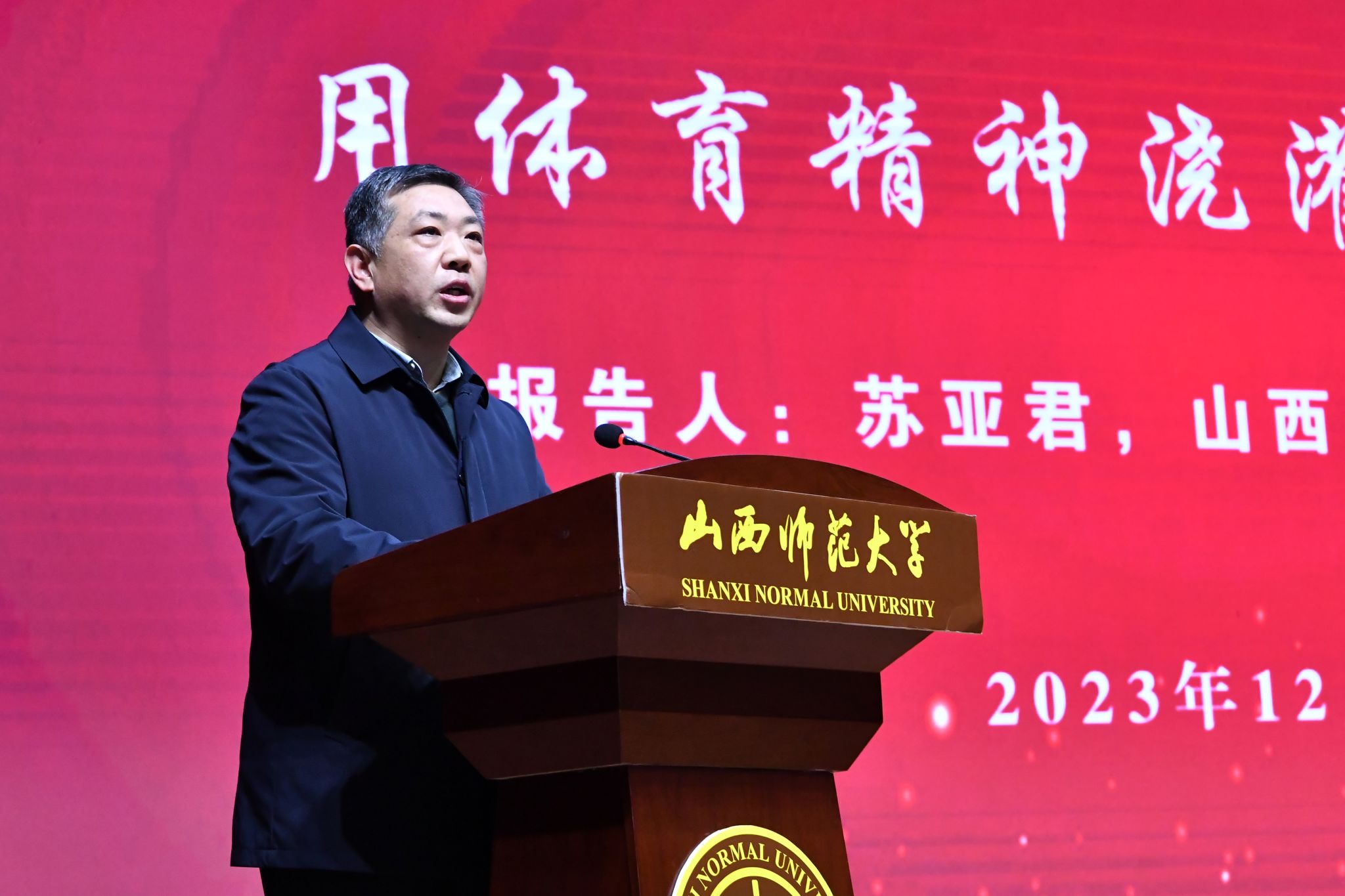 12月12日下午,7790cnm必发集团在科学会堂报告厅举办第二期“体育思政大讲堂”,特邀山西省体育总会主席苏亚君作了以《用体育精神浇灌人生之华》为主题的报告。校科技部部长安建梅,图书馆馆长周安星,院党委书记卫建平,院长郑旗,党委副书记张大为,副院长李向前、李海伟以及各系部主要负责人、师生代表400余人聆听了报告,报告会由院党委书记卫建平主持。