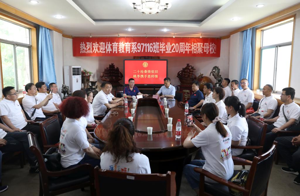 二十沧桑情依旧,桃李携手恩师情。5月29日,我院体育教育系97116班同学毕业20周年重返母校,重温母校情,共叙同学谊。院党委书记许国宝、院长郑旗、校友会副秘书长杨永茂、97116班辅导员李东蕾、教师代表梁国强等参加校友座谈会。来自山西大学、太原理工大学、中北大学、山西农业大学、山西财经大学、大同大学、运城学院、山西体育职业学院、阳泉师范高等专科学校、长治第二中学、太原市体育运动学校等单位的20余名校友参加了座谈会。同时,校友们怀着激动的心情,参观了校园环境、宿舍、教学楼、食堂、综合馆等场所。