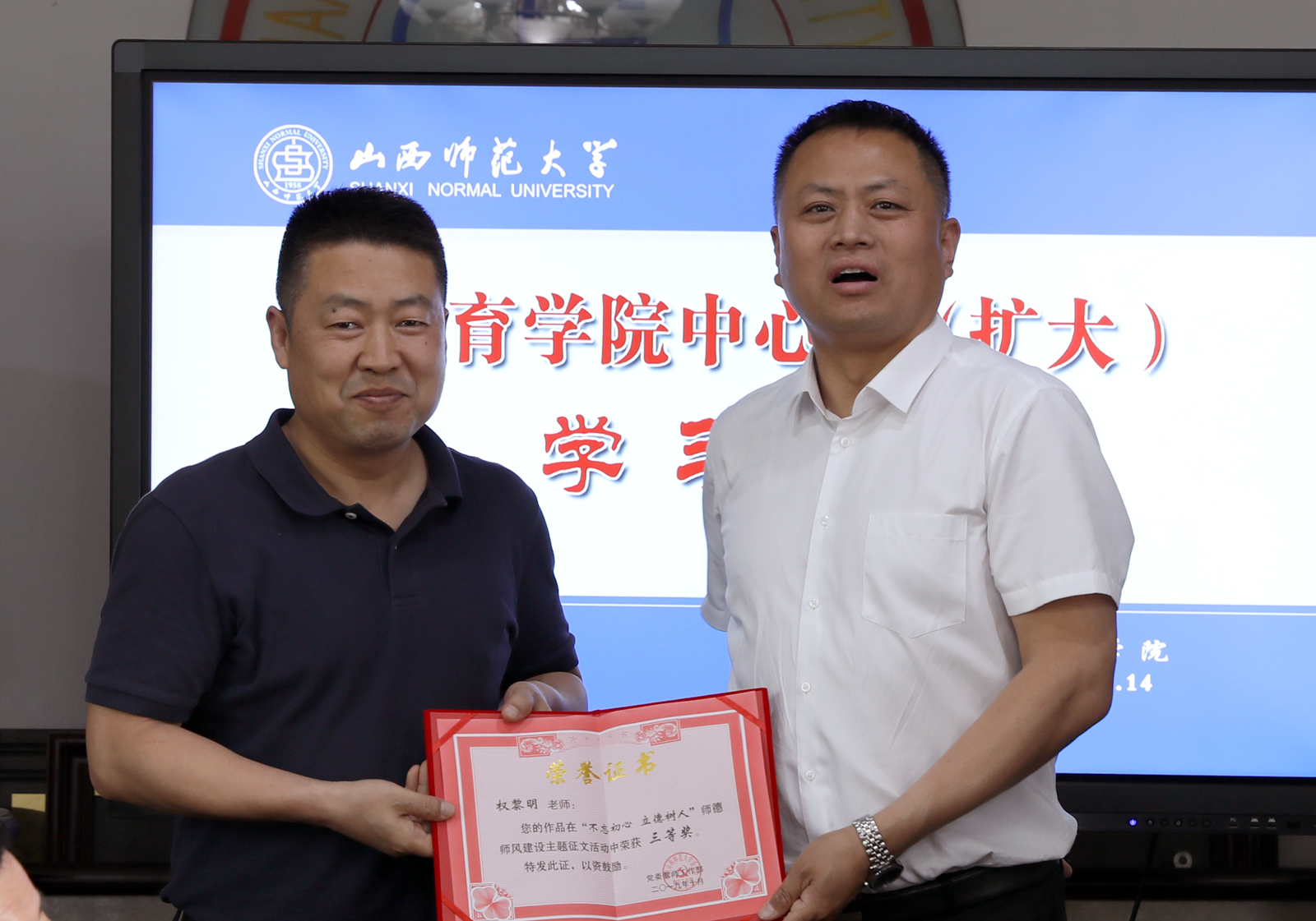 最后,许书记还通报了我院权黎明副教授、吴宣廷老师、卫玲玲老师、侯亚丽老师在学校组织的“不忘初心、立德树人”征文活动中的获奖情况,号召大家要向他们学习,积极参加学校、学院组织的活动,取得更大的成果,获得更好的成绩。(院办/文 邓碾管/摄影)