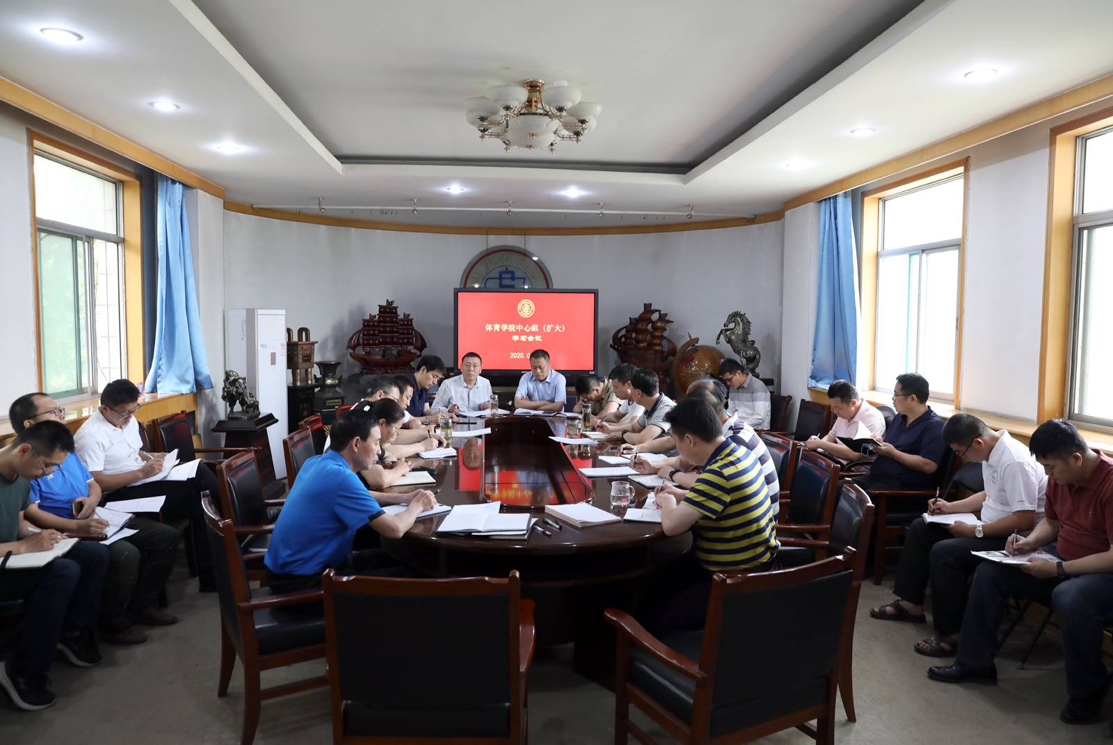 6月1日上午,7790cnm必发集团党委中心组(扩大)在东会议室传达学习学校相关会议精神,全体院领导、院工会主席、各支部书记、各系部科室正副主任及团委负责人参加会议。学习会上,院党委书记许国宝传达学习了学校联防联控第十一次工作通气会及学校2020年第二季度党务工作会议精神。他强调,大家要把党的政治建设放在首位,严肃党内政治生活,持续深入开展“三会一课”制,抓好各支部品牌活动等;要坚持立德树人,结合体育特色,充分挖掘课程思政元素。并要求大家注重学用结合,通过理论学习,提高工作自觉性与主动性;要高度重视意识形态管控,狠抓学院安全工作,各部门迅速开展安全排查,建立安全工作台账;要重点关注学生思想动态和心理状况,针对性的做好教育引导和心理疏导工作。(院办公室/文 邓碾管/摄)