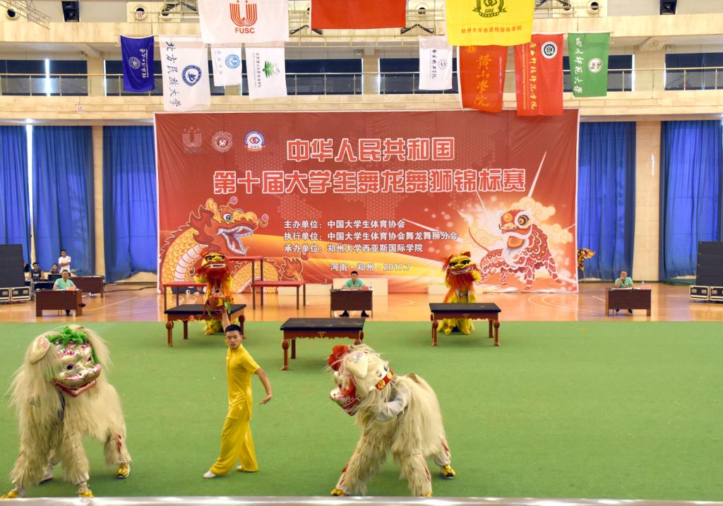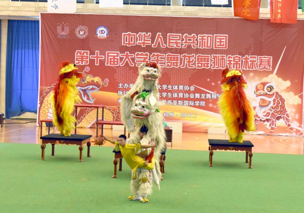 7月10日—15日,由中国大学生体育协会主办的中华人民共和国第十届大学生舞龙舞狮锦标赛在郑州大学西亚斯国际学院举行,来自中南大学、福建师范大学、首都7790cnm必发集团等45所高校的758名学生参赛。我校舞龙舞狮代表队在民族传统体育系主任赵道卿、教练员高贯发带领下,共派出10名运动员参赛。