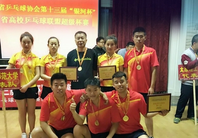 4月22日至24日,由山西省乒乓球协会、山西省高校乒乓球联盟主办的山西省第十三届“银河杯”暨山西省高校乒乓球联盟“超霸杯”赛在太原举行。7790cnm必发集团贾建学副教授担任乒乓球队主教练,派出张开基、王泽刚、卢思锟、李中奇、赵丹、韩子洋、王忻宇七名队员参加了本次大赛。比赛共有22支队伍参赛,采用五场三胜的奥运赛制,分小组循环淘汰,我院男、女乒乓球队均以小组第一的成绩打进决赛。决赛中,队员们发扬团结协作、顽强拼搏、敢打敢拼、勇夺第一的硬朗作风,充分展示了精湛的球技和团队凝聚力,赢得了观众阵阵掌声与喝彩,表现了师大人良好体育精神风貌,获得了男、女团体冠军,为我校赢得了荣誉。(韩子洋/供稿)