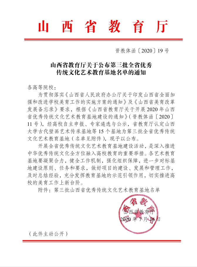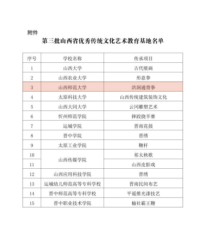 近日,省教育厅下发了《山西省教育厅关于公布第三批全省优秀传统文化艺术教育基地名单的通知》(晋教体函〔2020〕19号),全省共有15所高校的16个基地入选。我院申报的“洪洞通背拳”成功获批。
