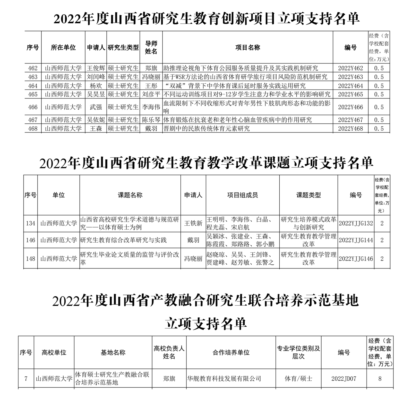 10月12日,山西省教育厅公布了2022年度研究生教育创新计划各类项目名单(晋教研[2022]1号),我院王铁新教授、戴羽副教授、冯晓丽教授获批研究生教育教学改革课题,王俊辉等7位硕士研究生获批研究生创新项目,郑旗教授负责、与华舰教育科技发展有限公司董事长岳建民合作的项目获批“山西省产教融合研究生联合培养示范基地”。这些项目的立项对促进我院研究生教学改革持续发展,提高人才培养能力,紧密对接区域行业发展,创新校企协同育人模式,提升研究生培养质量具有一定的作用和现实意义。(院研究生部供稿)