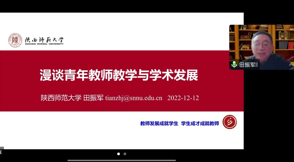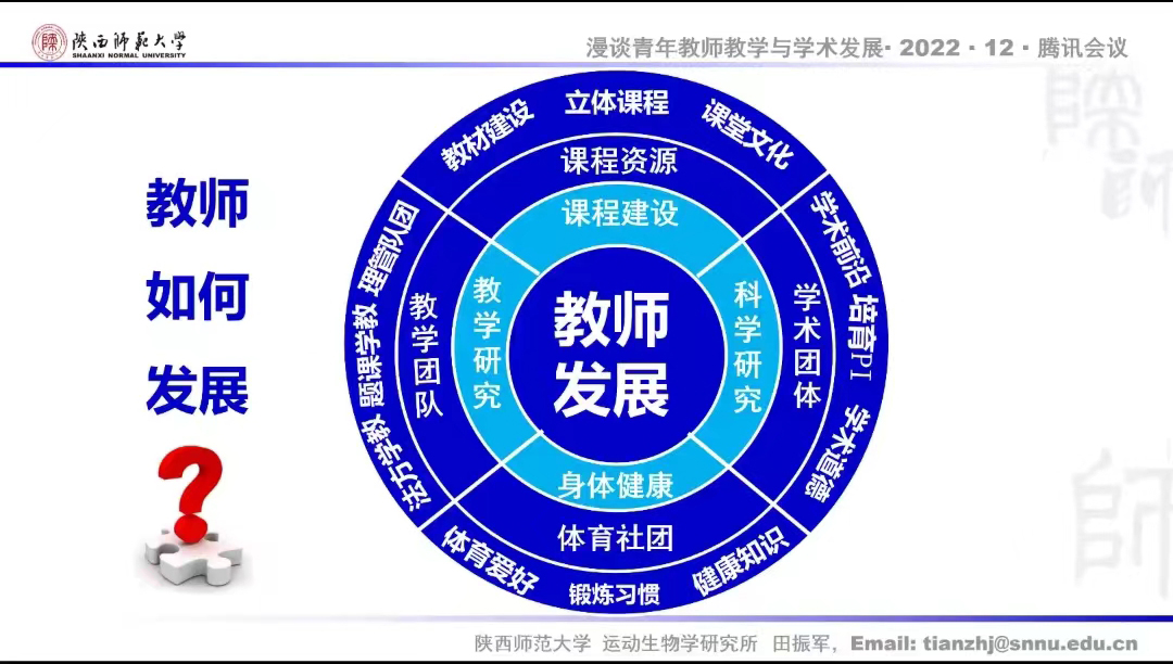 12月12日,我院举行2022年系列学术报告第六讲,邀请陕西师范大学运动生物学研究所所长,美国马里兰大学高访教授,全国模范教师,全国师德标兵,国务院政府特殊津贴专家,博士生导师田振军教授进行了题为《漫谈青年教师的教学与学术发展》的学术报告,报告由副院长李海伟主持,我院部分教师和全体研究生线上聆听了报告。