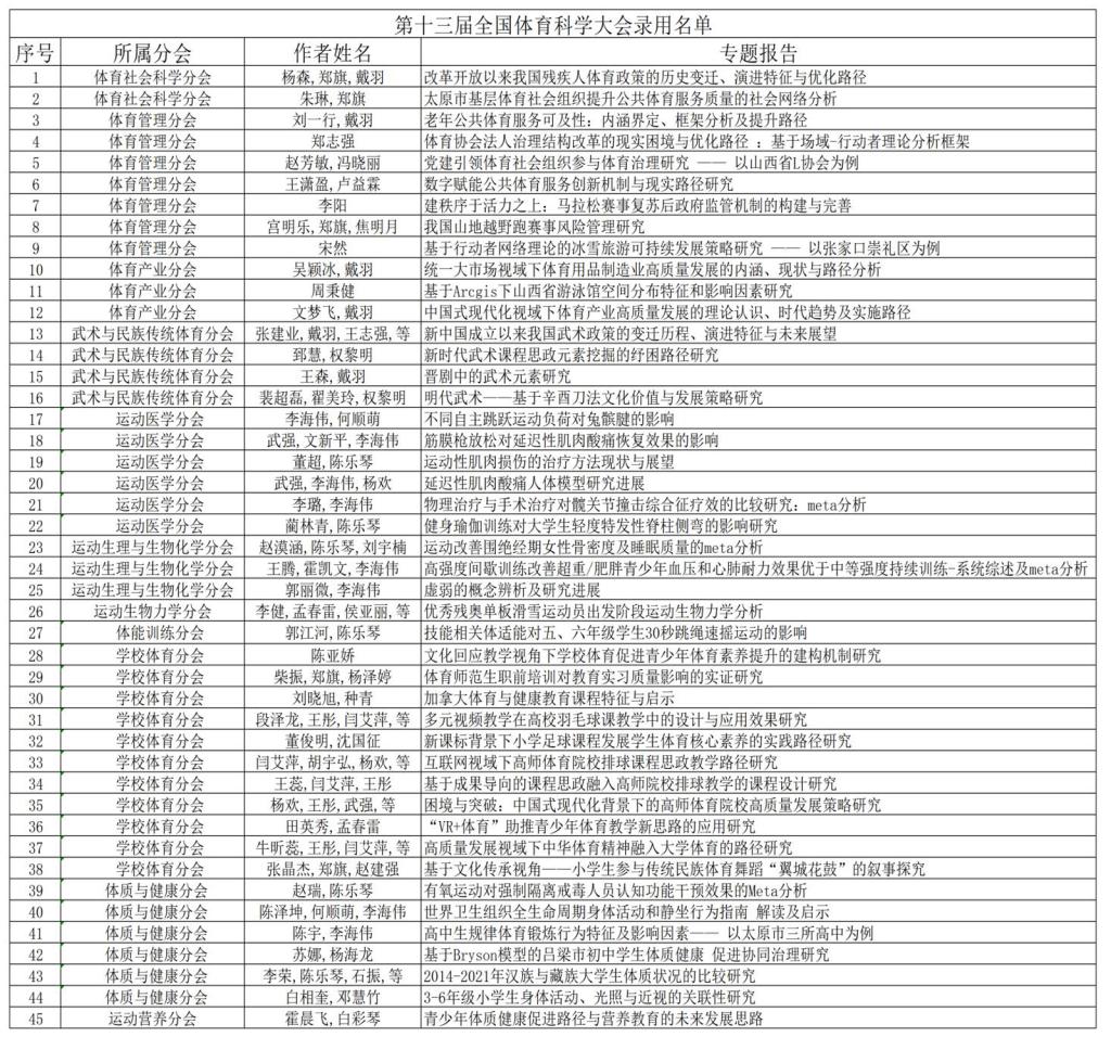 全国体育科学大会是国内最具权威性和影响力的综合性体育学术会议,是全国体育科技工作者展示最新体育科研成果、交流科技信息的盛会。近日,中国体育科学学会公布了第十三届全国体育科学大会论文录取结果。我院通过积极组织和广泛动员,广大师生踊跃投稿,最终录用论文129篇,其中专题报告45篇、墙报交流73篇、书面交流11篇,入选论文涉及体育社会科学、体育管理、运动医学、学校体育等16个领域。本次入选论文层次、数量及人数均创新高,充分彰显了我院近年来在学科建设、科研水平以及人才培养等方面的成效。