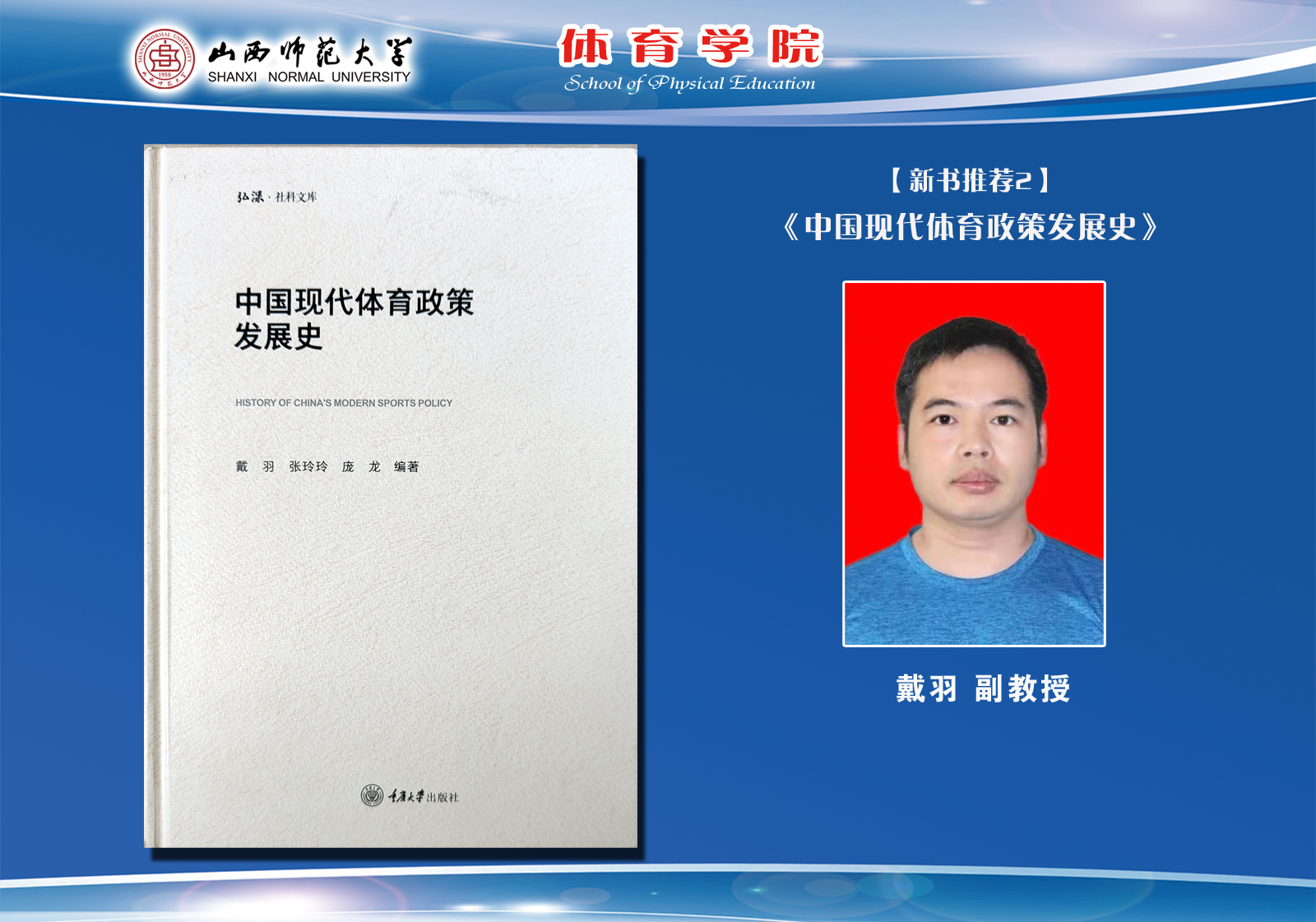 戴羽,1983年生,浙江瑞安人,历史学博士,体育学博士后,副教授,硕士研究生导师(体育学、中国史),中国体育科学学会体育史分会委员,山西省体育科学与运动医学协会委员,山西省科技厅专家。