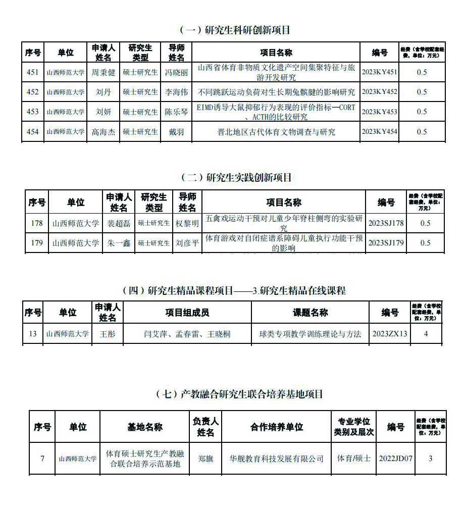 近日,山西省教育厅公布了2023年度研究生教育创新计划各类项目名单(晋教研[2023]2号),我院王彤教授获批研究生精品课程项目—研究生精品在线课程,硕士研究生周秉健等4位同学获批研究生科研创新项目,硕士研究生裴超磊等2位同学获批研究生实践创新项目,郑旗教授负责的体育硕士研究生产教融合联合培养示范基地获批产教融合研究生联合培养基地项目。(院研究生部供稿)