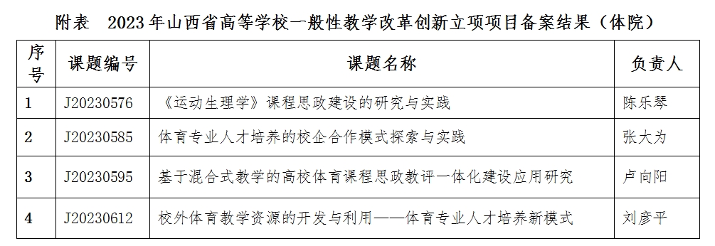 根据2023年山西省高等学校一般性教学改革创新立项项目备案结果的通知(晋教高[2023]10号),我院陈乐琴、张大为、卢向阳、刘彦平4位教师申报的教学改革课题备案立项(见附表)。省教育厅要求要加强项目管理,充分发挥一般性教学改革创新项目的示范引领作用,切实提高人才培养水平。(院教务科)