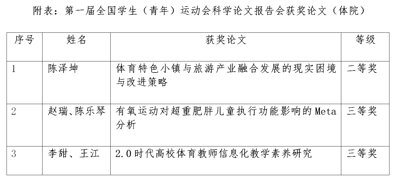 11月6日,第一届全国学生(青年)运动会科学论文报告会在南宁开幕,会议旨在推进新时代青少年和学校体育高质量发展。通过省级评审推送,科报会组委会经过专家评审,我院3篇论文入选获奖(见附表)。据悉,科报会面向全国大中小学体育教师、教练员,青少年和学校体育科研、教研、管理人员,教育行政管理人员及卫生保健人员征文,全国共报送论文2423篇,评选出获奖论文928篇,其中176篇为案例专题论文。(院研究部供稿)