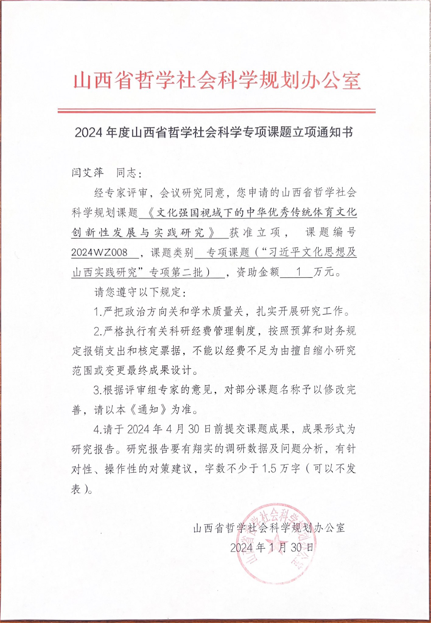 根据山西省哲学社会科学规划办文件通知,我院闫艾萍教授申请的山西省哲学社会规划课题《文化强国视域下的中华优秀传统体育文化创新性发展与实践研究》获准立项。(学院办公室)