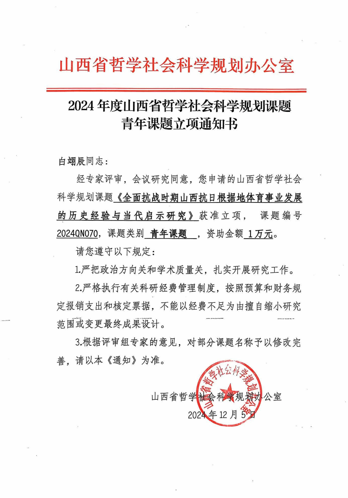 根据山西省哲学社至公室公示的2024年度山西省哲学社会科学规划课题立项名单,经专家评审、会议研究等程序,我院白翊辰博士申报的“全面抗战时期山西抗日根据地体育事业发展的历史经验与当代启示研究”获得青年项目立项公示,项目编号:2024QN070。