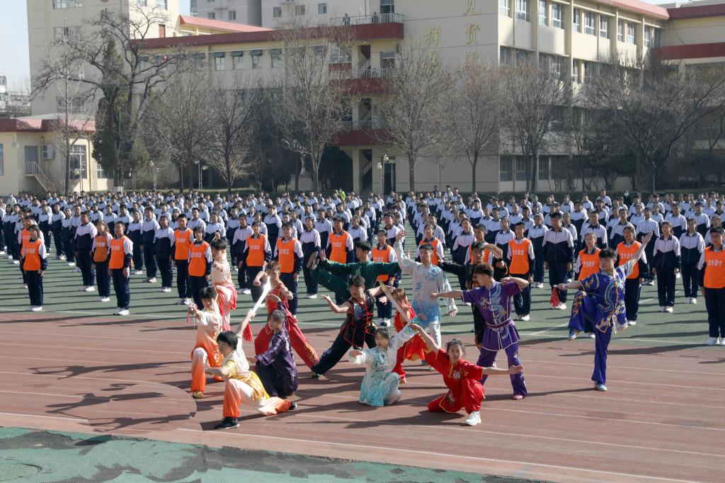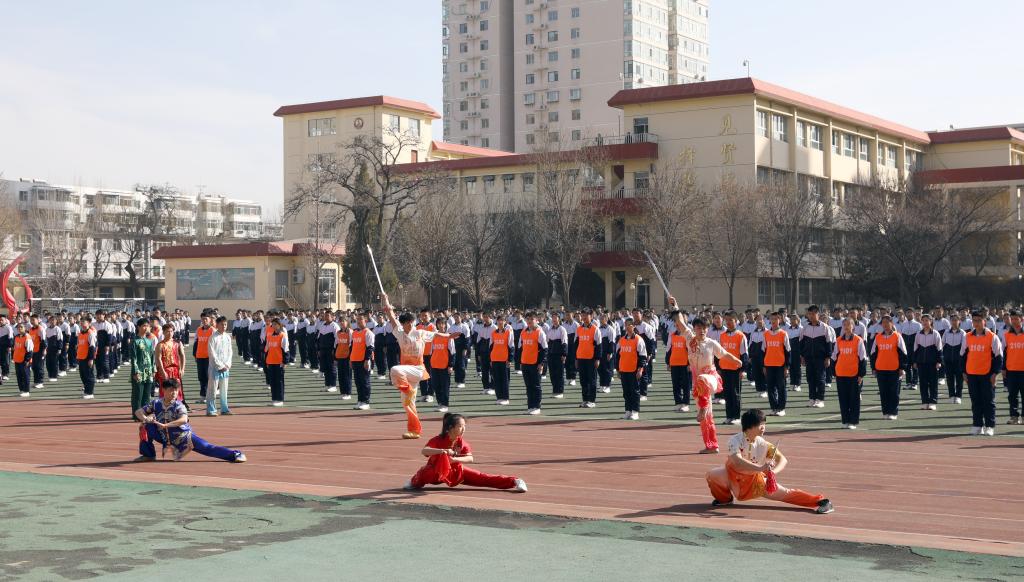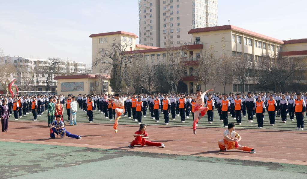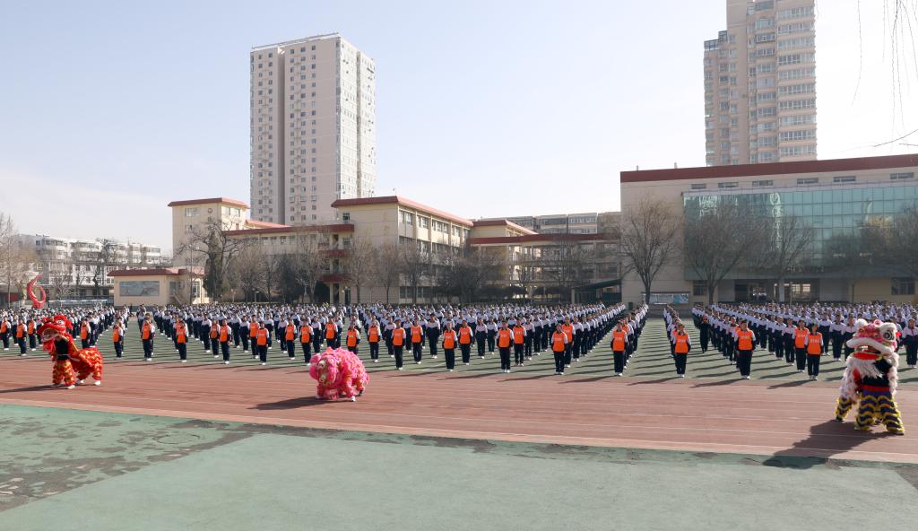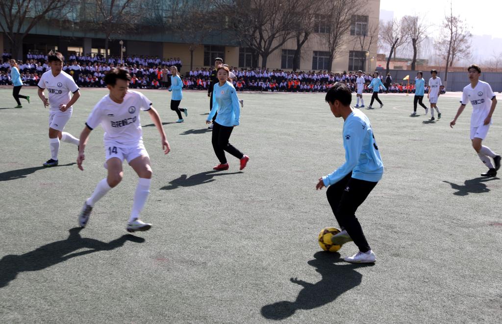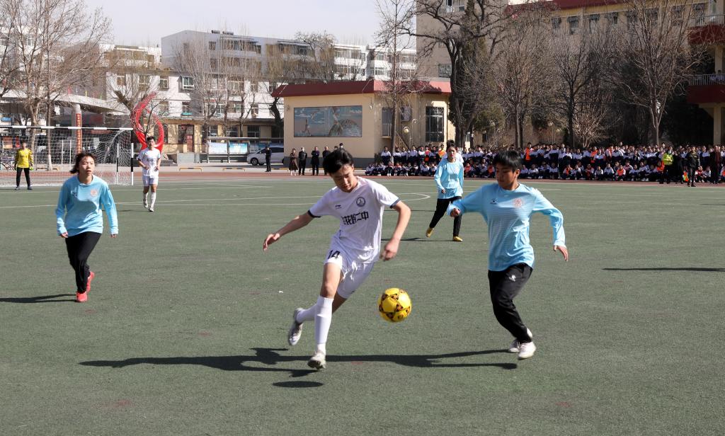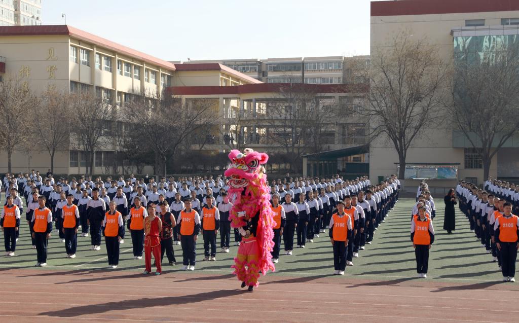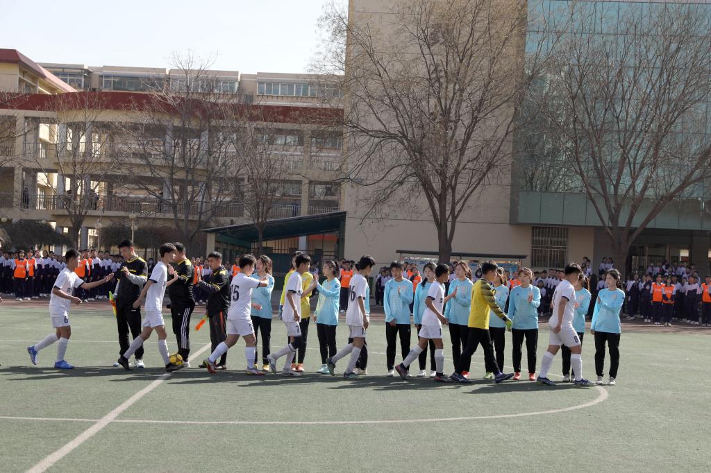 仪式开始前进行了学生汇报表演。杏花岭区二中学生作了“阳光”大课间操展示,7790cnm必发集团民族传统体育系学生表演了舞狮和武术。随后我校女足与杏花岭二中男足进行了足球友谊赛,双方争抢激烈,攻防转换迅速,双方球员的细腻脚法赢得观众阵阵掌声。