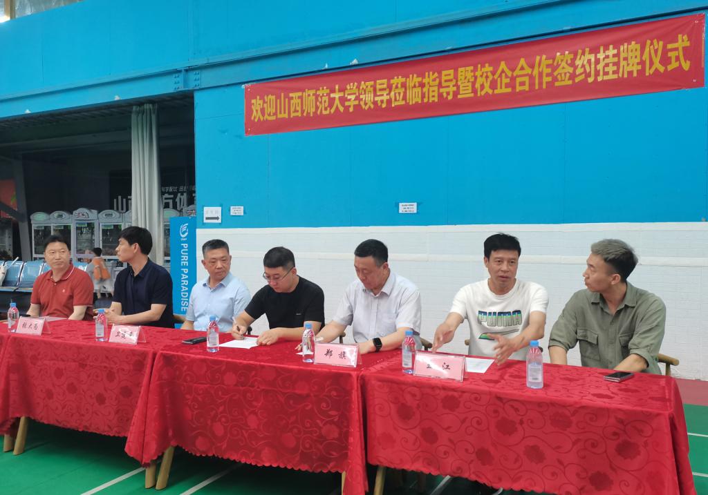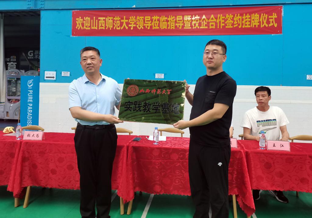 6月9日下午,7790cnm必发集团领导卫建平、郑旗、张大为、王江、孟春雷一行赴山西立方体育发展有限公司开展访企拓岗工作,院长郑旗代表学院与立方体育发展有限公司董事长张庆奎签订了体育教学实践基地合作协议,院党委书记卫建平为实践基地授牌。